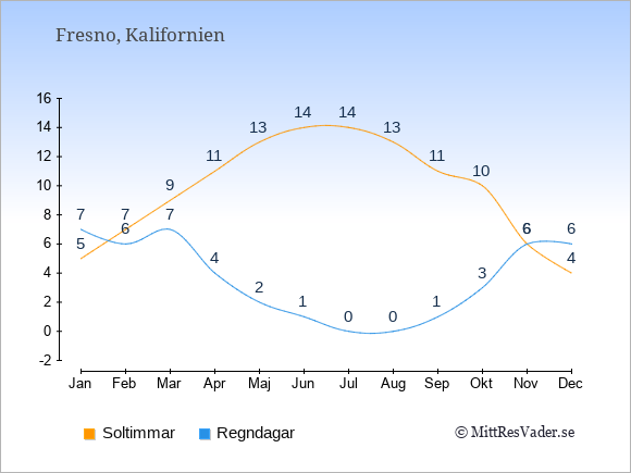 Grafen visar det genomsnittliga antalet soltimmar i Fresno under en viss månad (soltimmar är det antalet timmar per dag där solen skinnar), och antalet regndagar (dvs. det genomsnittliga antalet dagar