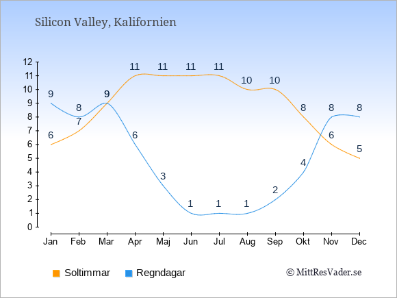 Grafen visar det genomsnittliga antalet soltimmar i Silicon Valley under en viss månad (soltimmar är det antalet timmar per dag där solen skinnar), och antalet regndagar (dvs. det genomsnittliga antalet dagar