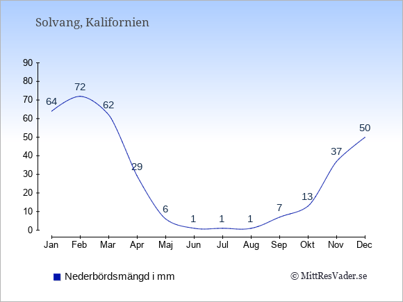 För att se hur vädret i Solvang skiljer sig från vädret hemma, kan du också jämföra siffrorna måned för måned med motsvarande siffror för Sverige under samma period här: Solvangs klimat.