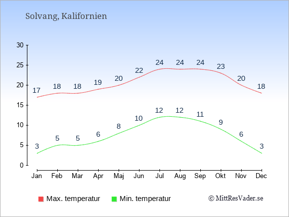 Grafen visar de genomsnittligt högsta temperaturerna i Solvang (vanligtvis det värde som uppmätts mitt på dagen) och de genomsnittligt lägsta temperaturer (vanligtvis tidpunkten just innan soluppgång).