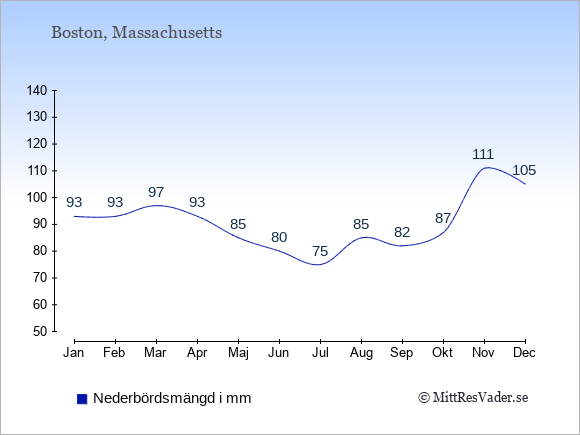 För att se hur vädret i Boston skiljer sig från vädret hemma, kan du också jämföra siffrorna måned för måned med motsvarande siffror för Sverige under samma period här: Bostons klimat.