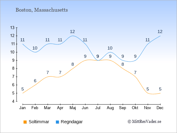 Väder i Boston: Soltimmar och regndagar