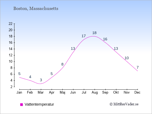 Få en överblick över vädret i Boston månad för månad med temperaturer, vattentemperatur, soltimmar och nederbörd.