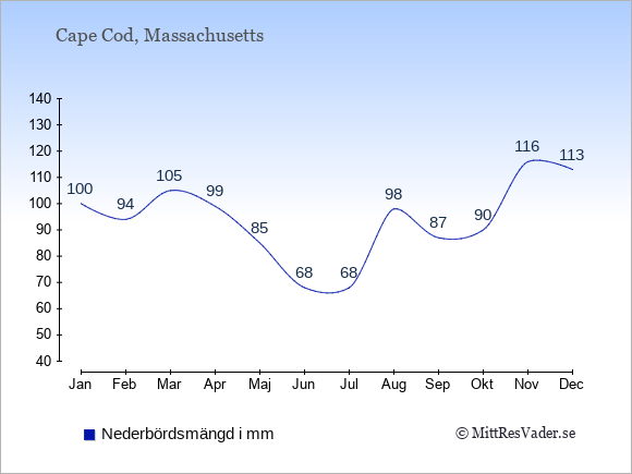 För att se hur vädret på Cape Cod skiljer sig från vädret hemma, kan du också jämföra siffrorna måned för måned med motsvarande siffror för Sverige under samma period här: Cape Cods klimat.