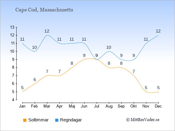 Grafen visar det genomsnittliga antalet soltimmar på Cape Cod under en viss månad (soltimmar är det antalet timmar per dag där solen skinnar), och antalet regndagar (dvs. det genomsnittliga antalet dagar