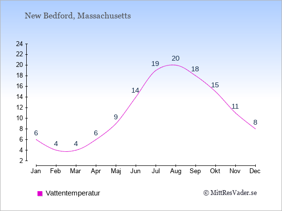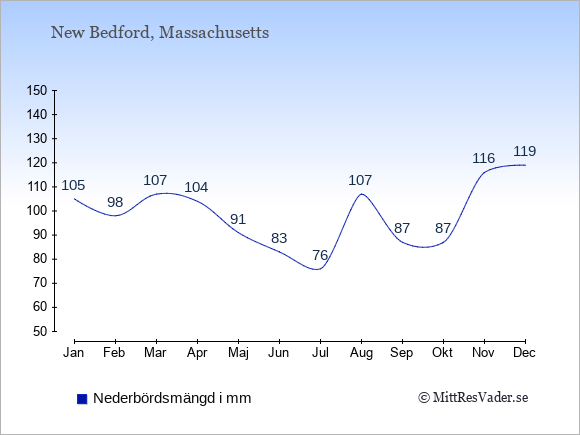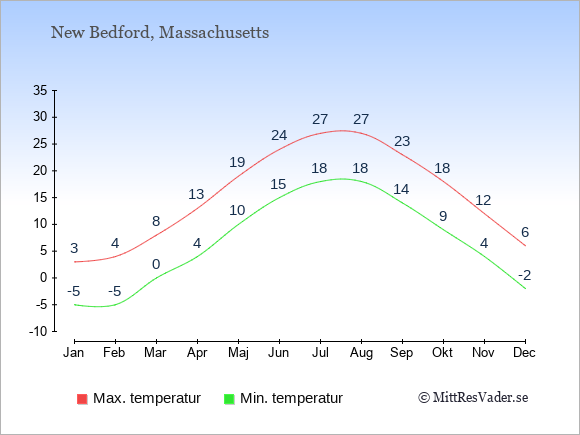 För att se hur vädret i New Bedford skiljer sig från vädret hemma, kan du också jämföra siffrorna måned för måned med motsvarande siffror för Sverige under samma period här: New Bedfords klimat.