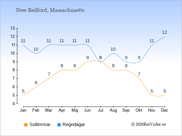 Väder i New Bedford: Soltimmar och regndagar