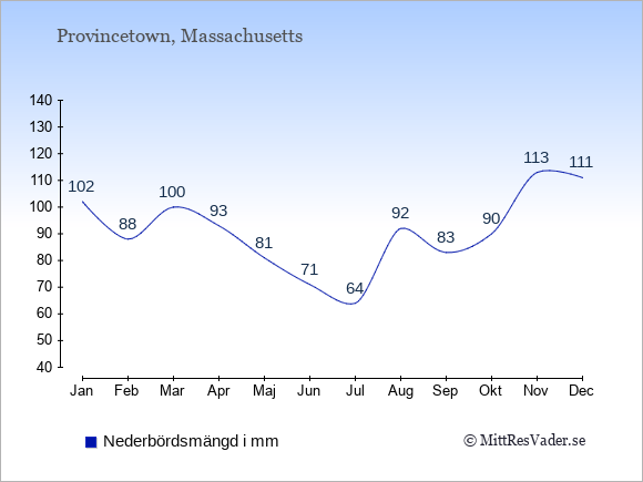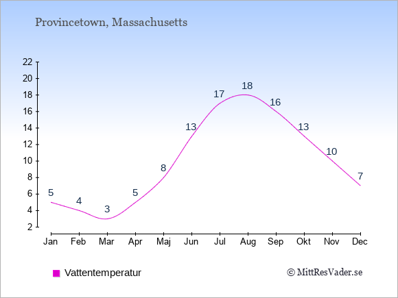 För att se hur vädret i Provincetown skiljer sig från vädret hemma, kan du också jämföra siffrorna måned för måned med motsvarande siffror för Sverige under samma period här: Provincetowns klimat.