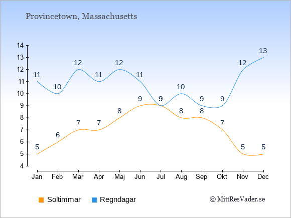 Grafen visar det genomsnittliga antalet soltimmar i Provincetown under en viss månad (soltimmar är det antalet timmar per dag där solen skinnar), och antalet regndagar (dvs. det genomsnittliga antalet dagar