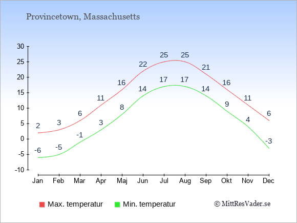 Grafen visar de genomsnittligt högsta temperaturerna i Provincetown (vanligtvis det värde som uppmätts mitt på dagen) och de genomsnittligt lägsta temperaturer (vanligtvis tidpunkten just innan soluppgång).