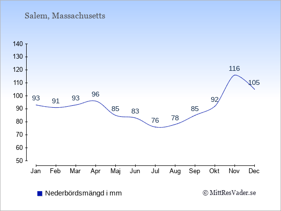 För att se hur vädret i Salem skiljer sig från vädret hemma, kan du också jämföra siffrorna måned för måned med motsvarande siffror för Sverige under samma period här: Salems klimat.