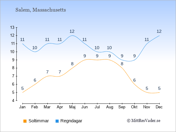 Grafen visar det genomsnittliga antalet soltimmar i Salem under en viss månad (soltimmar är det antalet timmar per dag där solen skinnar), och antalet regndagar (dvs. det genomsnittliga antalet dagar
