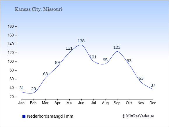 För att se hur vädret i Kansas City skiljer sig från vädret hemma, kan du också jämföra siffrorna måned för måned med motsvarande siffror för Sverige under samma period här: Kansas Citys klimat.