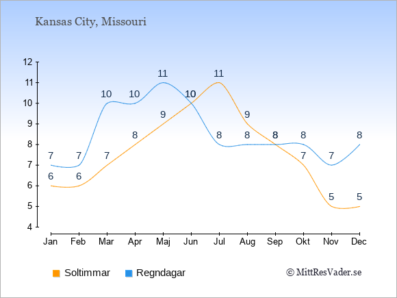 Grafen visar det genomsnittliga antalet soltimmar i Kansas City under en viss månad (soltimmar är det antalet timmar per dag där solen skinnar), och antalet regndagar (dvs. det genomsnittliga antalet dagar