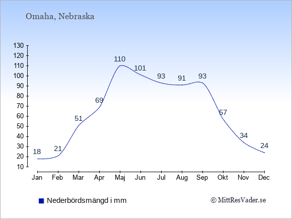 För att se hur vädret i Omaha skiljer sig från vädret hemma, kan du också jämföra siffrorna måned för måned med motsvarande siffror för Sverige under samma period här: Omahas klimat.