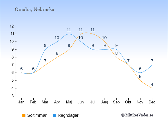 Grafen visar det genomsnittliga antalet soltimmar i Omaha under en viss månad (soltimmar är det antalet timmar per dag där solen skinnar), och antalet regndagar (dvs. det genomsnittliga antalet dagar