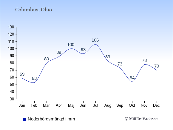 För att se hur vädret i Columbus skiljer sig från vädret hemma, kan du också jämföra siffrorna måned för måned med motsvarande siffror för Sverige under samma period här: Columbus klimat.