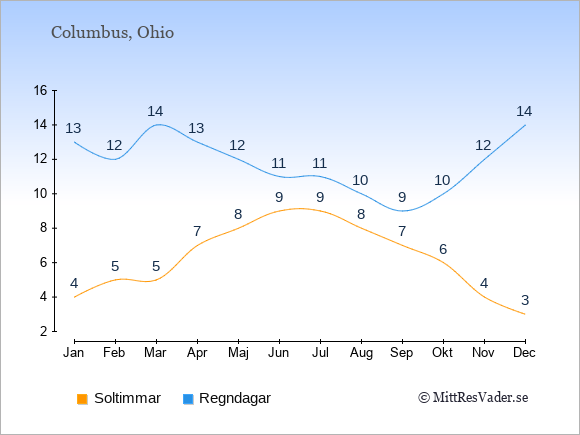 Grafen visar det genomsnittliga antalet soltimmar i Columbus under en viss månad (soltimmar är det antalet timmar per dag där solen skinnar), och antalet regndagar (dvs. det genomsnittliga antalet dagar