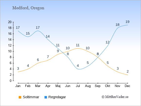 Grafen visar det genomsnittliga antalet soltimmar i Medford under en viss månad (soltimmar är det antalet timmar per dag där solen skinnar), och antalet regndagar (dvs. det genomsnittliga antalet dagar