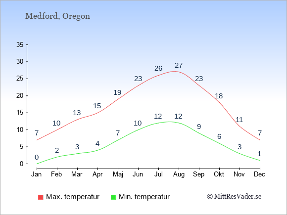 Grafen visar de genomsnittligt högsta temperaturerna i Medford (vanligtvis det värde som uppmätts mitt på dagen) och de genomsnittligt lägsta temperaturer (vanligtvis tidpunkten just innan soluppgång).