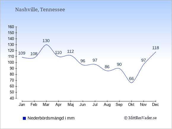 För att se hur vädret i Nashville skiljer sig från vädret hemma, kan du också jämföra siffrorna måned för måned med motsvarande siffror för Sverige under samma period här: Nashvilles klimat.