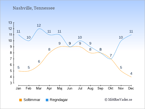 Grafen visar det genomsnittliga antalet soltimmar i Nashville under en viss månad (soltimmar är det antalet timmar per dag där solen skinnar), och antalet regndagar (dvs. det genomsnittliga antalet dagar
