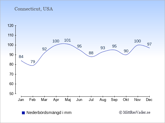 För att se hur vädret i Connecticut skiljer sig från vädret hemma, kan du också jämföra siffrorna måned för måned med motsvarande siffror för Sverige under samma period här: Connecticuts klimat.