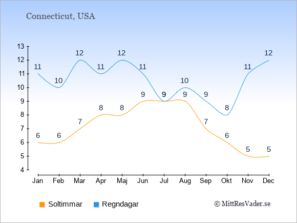 Grafen visar det genomsnittliga antalet soltimmar i Connecticut under en viss månad (soltimmar är det antalet timmar per dag där solen skinnar), och antalet regndagar (dvs. det genomsnittliga antalet dagar