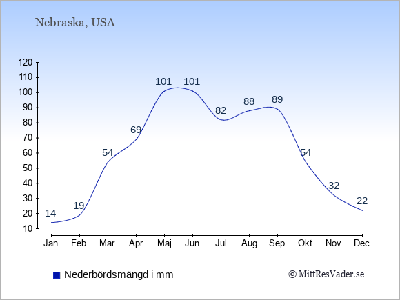 För att se hur vädret i Nebraska skiljer sig från vädret hemma, kan du också jämföra siffrorna måned för måned med motsvarande siffror för Sverige under samma period här: Nebraskas klimat.