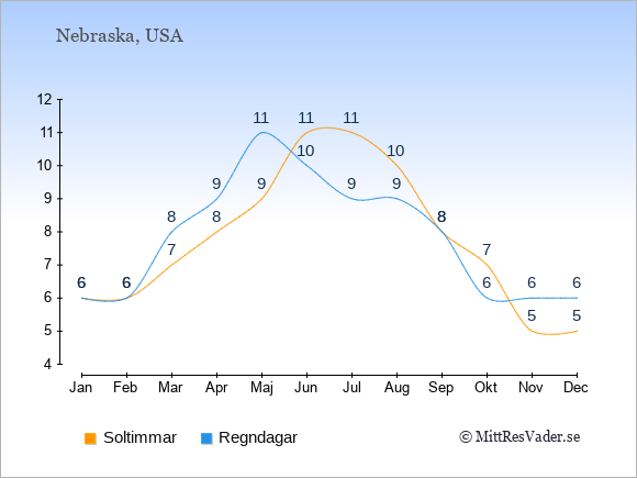 Grafen visar det genomsnittliga antalet soltimmar i Nebraska under en viss månad (soltimmar är det antalet timmar per dag där solen skinnar), och antalet regndagar (dvs. det genomsnittliga antalet dagar