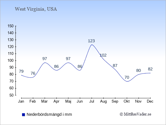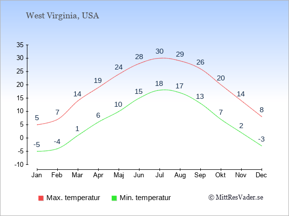 För att se hur vädret i West Virginia skiljer sig från vädret hemma, kan du också jämföra siffrorna måned för måned med motsvarande siffror för Sverige under samma period här: West Virginias klimat.