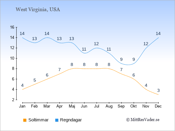 Grafen visar det genomsnittliga antalet soltimmar i West Virginia under en viss månad (soltimmar är det antalet timmar per dag där solen skinnar), och antalet regndagar (dvs. det genomsnittliga antalet dagar