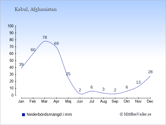För att se hur vädret i Afghanistan skiljer sig från vädret hemma, kan du också jämföra siffrorna måned för måned med motsvarande siffror för Sverige under samma period här: Afghanistans klimat.