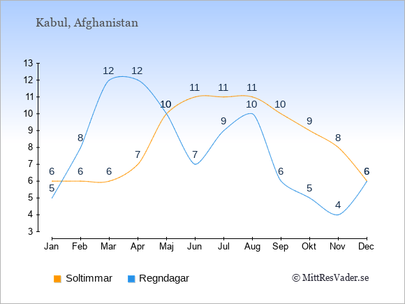 Grafen visar det genomsnittliga antalet soltimmar i Afghanistan under en viss månad (soltimmar är det antalet timmar per dag där solen skinnar), och antalet regndagar (dvs. det genomsnittliga antalet dagar