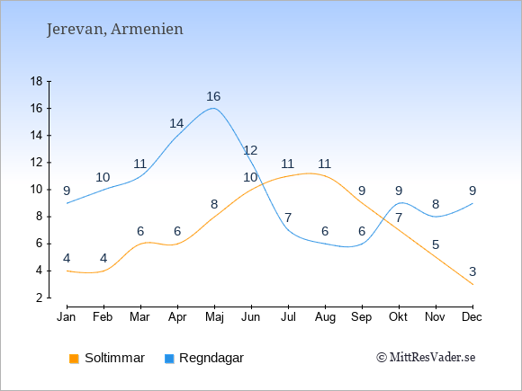 Grafen visar det genomsnittliga antalet soltimmar i Armenien under en viss månad (soltimmar är det antalet timmar per dag där solen skinnar), och antalet regndagar (dvs. det genomsnittliga antalet dagar