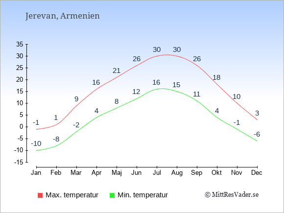 Normalt ligger temperaturen i Armenien (Jerevan) därför i en viss månad i intervallet mellan den genomsnittligt högsta och lägsta temperatur. I juli är det till exempel oftast upp till ca. 30 grader under dagen