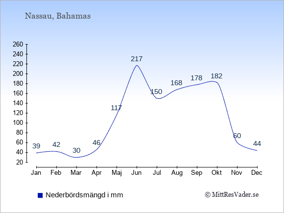 För att se hur vädret på Bahamas skiljer sig från vädret hemma, kan du också jämföra siffrorna måned för måned med motsvarande siffror för Sverige under samma period här: Bahamas klimat.