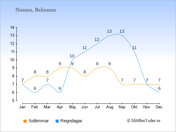 Grafen visar det genomsnittliga antalet soltimmar på Bahamas under en viss månad (soltimmar är det antalet timmar per dag där solen skinnar), och antalet regndagar (dvs. det genomsnittliga antalet dagar