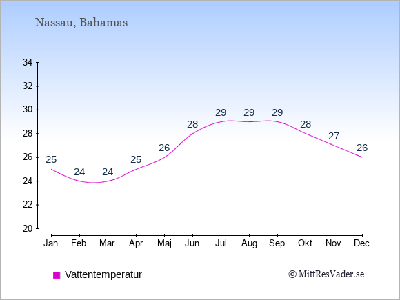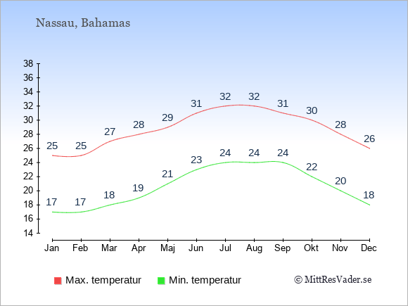 Normalt ligger temperaturen på Bahamas (Nassau) därför i en viss månad i intervallet mellan den genomsnittligt högsta och lägsta temperatur. I juli är det till exempel oftast upp till ca. 32 grader under dagen