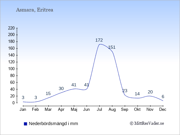 För att se hur vädret i Eritrea skiljer sig från vädret hemma, kan du också jämföra siffrorna måned för måned med motsvarande siffror för Sverige under samma period här: Eritreas klimat.