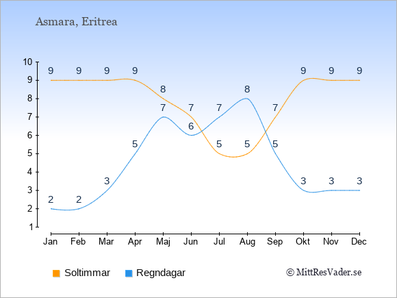 Grafen visar det genomsnittliga antalet soltimmar i Eritrea under en viss månad (soltimmar är det antalet timmar per dag där solen skinnar), och antalet regndagar (dvs. det genomsnittliga antalet dagar