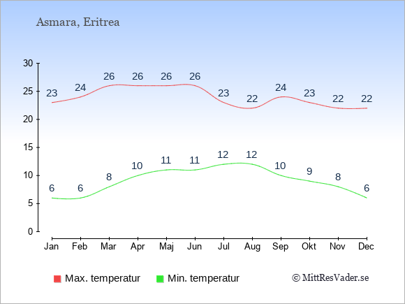 Normalt ligger temperaturen i Eritrea (Asmara) därför i en viss månad i intervallet mellan den genomsnittligt högsta och lägsta temperatur. I juli är det till exempel oftast upp till ca. 23 grader under dagen