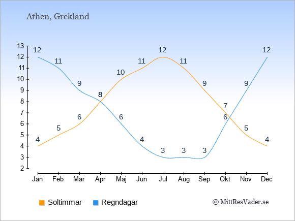 Grafen visar det genomsnittliga antalet soltimmar i Grekland under en viss månad (soltimmar är det antalet timmar per dag där solen skinnar), och antalet regndagar (dvs. det genomsnittliga antalet dagar