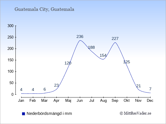 För att se hur vädret i Guatemala skiljer sig från vädret hemma, kan du också jämföra siffrorna måned för måned med motsvarande siffror för Sverige under samma period här: Guatemalas klimat.