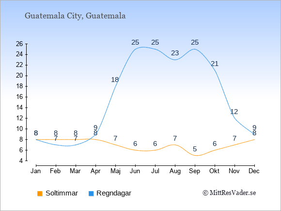 Grafen visar det genomsnittliga antalet soltimmar i Guatemala under en viss månad (soltimmar är det antalet timmar per dag där solen skinnar), och antalet regndagar (dvs. det genomsnittliga antalet dagar