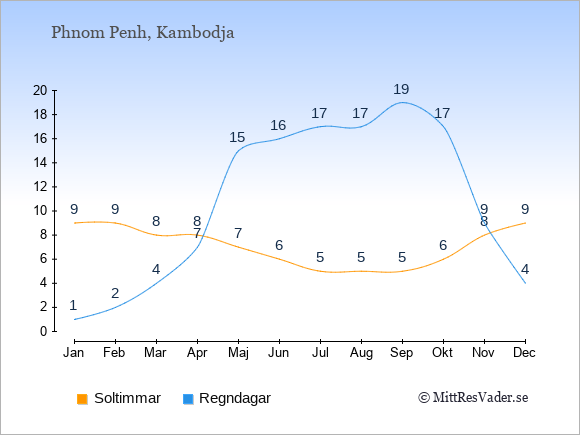 Grafen visar det genomsnittliga antalet soltimmar i Kambodja under en viss månad (soltimmar är det antalet timmar per dag där solen skinnar), och antalet regndagar (dvs. det genomsnittliga antalet dagar