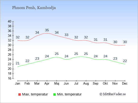 Normalt ligger temperaturen i Kambodja (Phnom Penh) därför i en viss månad i intervallet mellan den genomsnittligt högsta och lägsta temperatur. I juli är det till exempel oftast upp till ca. 32 grader under dagen