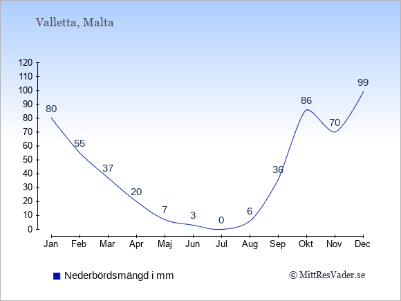 För att se hur vädret på Malta skiljer sig från vädret hemma, kan du också jämföra siffrorna måned för måned med motsvarande siffror för Sverige under samma period här: Maltas klimat.