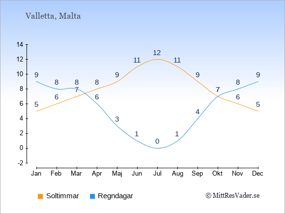Grafen visar det genomsnittliga antalet soltimmar på Malta under en viss månad (soltimmar är det antalet timmar per dag där solen skinnar), och antalet regndagar (dvs. det genomsnittliga antalet dagar
