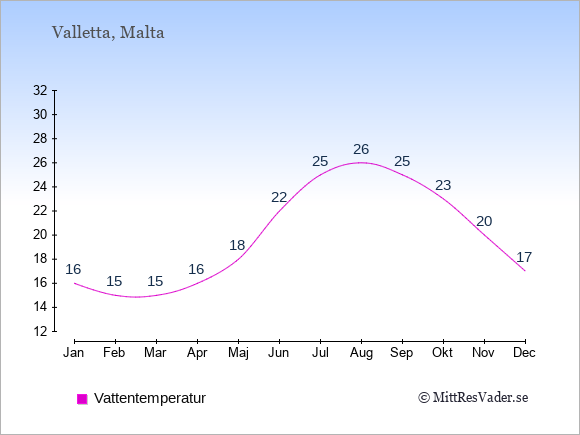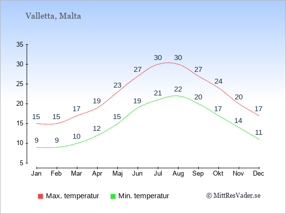 Normalt ligger temperaturen på Malta (Valletta) därför i en viss månad i intervallet mellan den genomsnittligt högsta och lägsta temperatur. I juli är det till exempel oftast upp till ca. 30 grader under dagen